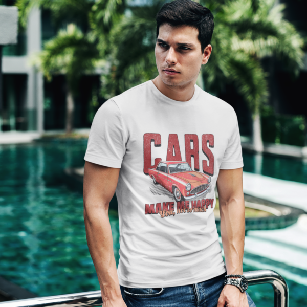 Fuel your passion with this crew neck tee that declares “Cars Make Me Happy” in bold, high-octane style.