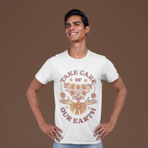 Rock this premium crew neck tee that screams eco-warrior vibes with bold “Take Care of Our Earth” graphics.